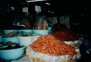 Chilies A market in the city of Chaing Mai, in addition to fruits and vegetables had displays of pig’s snouts, chickens with heads and feet, dried fish, live fish, dead fish, and smoked fish. There were mountains of food.