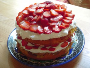 One of the strawberry recipes looked spectacular and tasted good but wasn’t worth the work. First a cake batter in the bottom of the pan, then a meringue spread over that. It was baked at 350 for twenty minutes. Meringue is usually baked in a low oven for an hour to make it crispy. This one turned out like sponge and pretty tasteless. The cake, berries and cream saved the dessert but another time I’d make separate meringues to layer with the cake and berries.